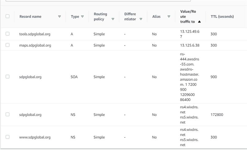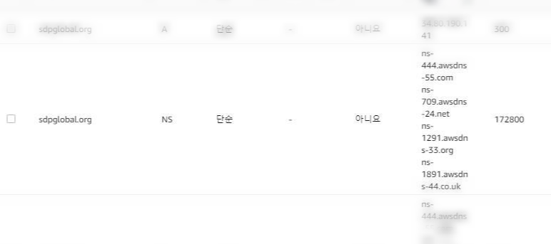 주목해야할 점은 sdpglobal.org 에서 유형이 NS(NameServer)로 된 행입니다. 지금은 awsdns로 정상 설정되어있네요.