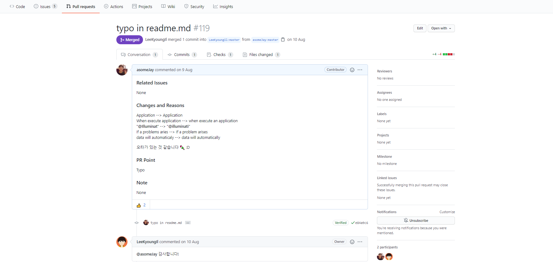 보통은 Issue를 먼저 확인해서 내가 PR하려는 주제가 있는지 살피고, 없다면 Issue를 등록해서 "내가 이러이러한 작업을 해서 PR을 날릴것이다."라고 말해준다고 한다. 나도 그러는 게 좋겠지만 사소한 Typo여서 따로 Issue를 등록하지 않고 바로 풀 리퀘스트를 날렸다.