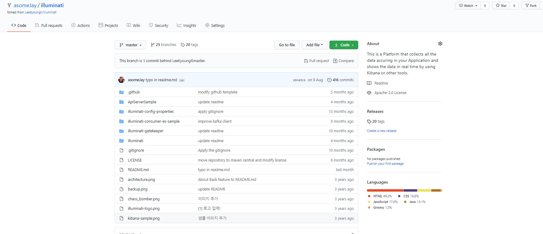 우선 원하는 Repository를 찾아서 Fork를 한다. 나는 이경일 개발자님의 Illuminati를 Fork했다. Illuminati는 Spring에서 로그를 자동으로 남겨준다. (나도 얼른 꼼꼼한 로그가 필요할 정도로 대규모 Product를 만지고 싶다.)