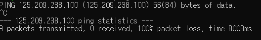 시간이 아무리 흘러도 변화가 없고 100% Packet Loss다. 보통 이런 경우는 Security 이슈이다. AWS로 따지면 Security Group의 문제다. Ping Flood DDos Attack을 막기 위해 Port 80을 제외한 곳으로부터의 접근을 원천 차단하는 경우가 있다.