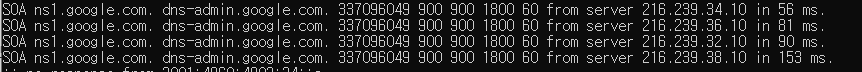 google.com의 경우 무슨 이유인지 몰라도 Mail Exchanger의 절반보다 살짝 오래 걸렸다. 약 36ms.