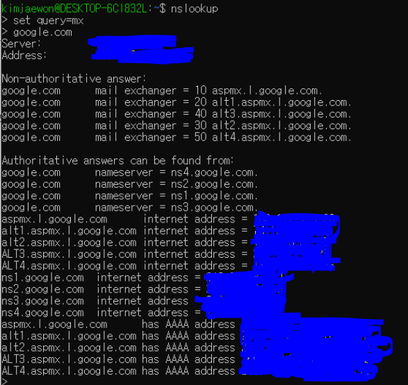 DNS 서버가 해당 도메인의 IP 주소를 찾아서 return 한다. 위의 예시에서는 google.com의 MX(Mail Exchange) record의 주소를 return 한다. 이 주소는 nslookup -query=mx google.com 을 통해 알 수 있다. 일반적인 구글 웹사이트의 IP가 아니라 Mail Exchanger의 주소를 찾는 것이기 때문에 IP나 DNS NS가 다를 수도 있다.