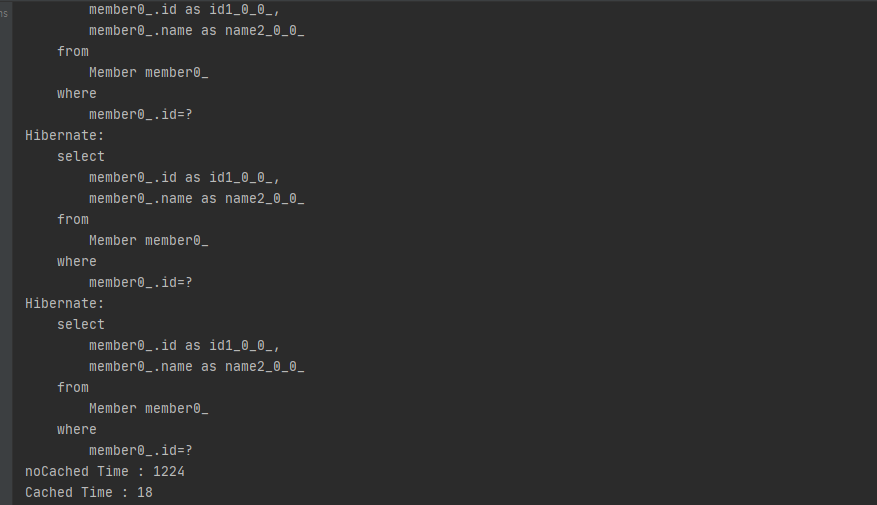 noCached Time을 측정할 때는 find마다 Query가 나가지만 Cached Time을 측정할 때는 1차 캐시에서 데이터를 가져오기 때문에 Query가 나가지 않는다.