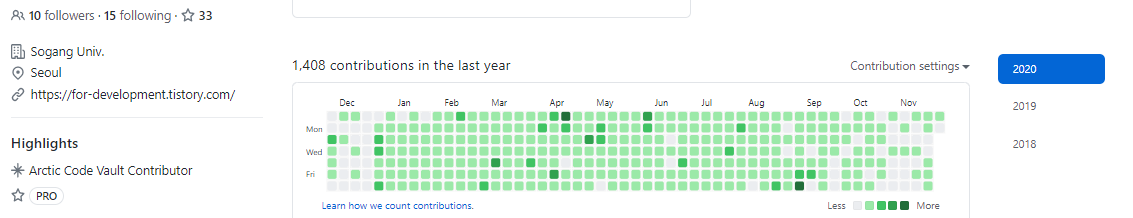 제 깃 헙입니다.(면접 준비하느라 회색깔이 많이 생겼어요 흑흑) 거의 모든 IT회사에서 Github주소를 기재할 수 있도록 했어요. 평소에 Git을 잘 관리하시는 것도 좋겠죠? 개발자라면 그 누구도 부정할 수 없는 잔디밭!