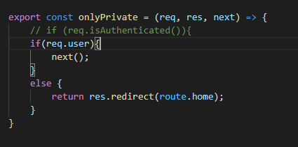예를 들어서 이런 함수를 만들어서 접근제어를 할 수 있다. req에 user가 있으면 인증된 사용자이고 없으면 인증되지 않은 사용자이다!