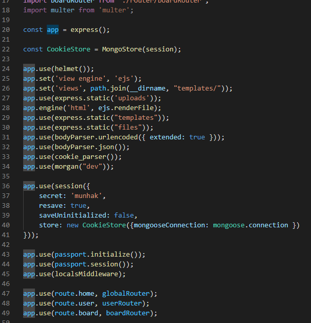 모든 요청은 app을 타고 들어온다. 예를 들어서 위에서부터 차례대로 helmet, cookie_parser, bodyParser... 를 동작한 다음 passport initialize가 실행된다. 공식 문서에 따르면 Express-Based Application에서 passport를 쓰려면 초기화를 해줘야한다.