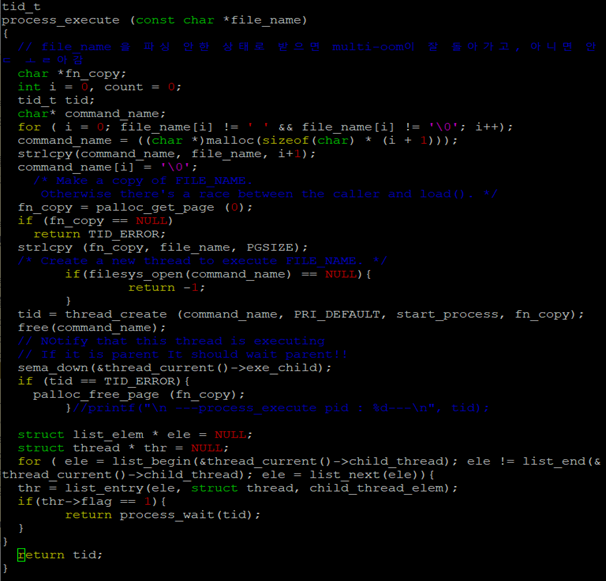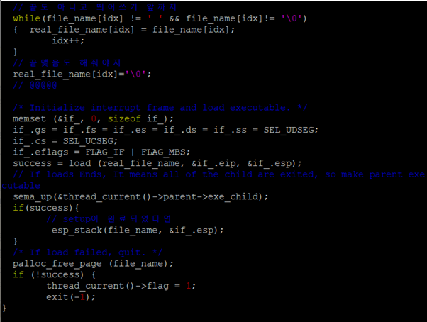 첫번째 사진은 proess_execute() 함수인데 thread_create()를 통해서 child Process를 만든다 Parent Process가 Child보다 먼저 죽는 경우를 막으려고 sema_down을 걸어주고 Child Process가 종료되면 sema_up을 해준다. 두번째 사진은 start_process의 내용인데 LOAD 함수가 정상적으로 끝나면 load가 잘 됐다는 거니까 부모 Process의 sema를 up 해준다. 이렇게 하면 load 함수가 실패하는 경우를 방어할 수 있다. 그리고 load가 잘 안되면 success가 false 일텐데 제일 밑에서 flag를 1로 바꿔줌으로써 Parent Process에서 비정상적으로 종료된 Child Process를 식별할 수 있다. (process_execute 밑에보면 flag가 1일 때의 Error 처리를 구현했다!!)