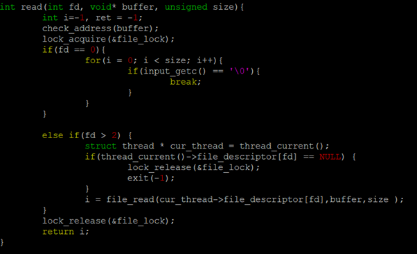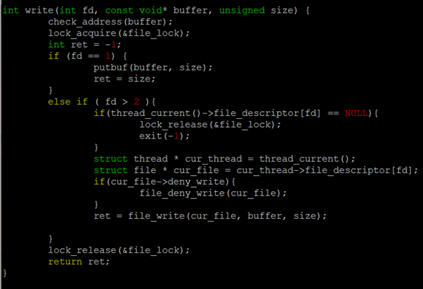 아까도 말했지만 read와 write는 다른 Process의 간섭을 거부한다. 그러므로 lock_acquire를 통해서 안락한 공간을 확보해주자. 만약 fd가 1이면 STDOUT 이므로 putbuf() 함수로 작업한다. 만약 그게 아니라면 fd가 3 이상이라는 의미다. 0은 STDIN, 1은 STDOUT, 2는 STDERR 이니까... 만약 STDERR가 뜰 때를 대비해서 미리 ret의 초기값을 -1로 줬다.