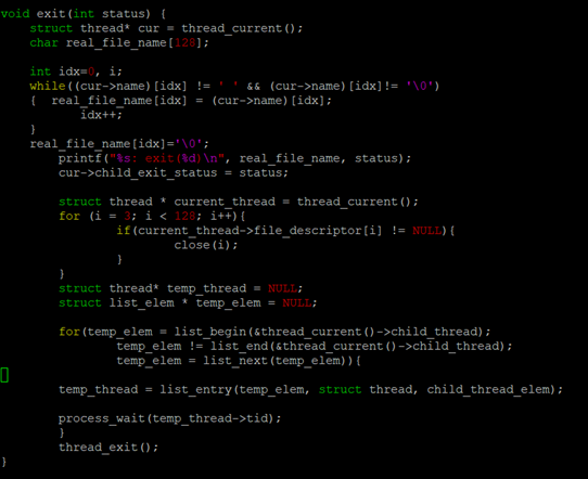 이전 프로젝트에서 구현한 System Call 이지만 file operation에 관한 내용을 추가했다. exit을 할 때 현재 thread의 Child Process의 List를 돌면서 Process_wait()를 수행한다. 부모 Process는 절대 자식 Process보다 먼저 죽으면 안 된다. 먼저 죽으면 Orphan Process, Zombie Process 등이 발생하면서 메모리 누수가 발생하기 때문이다. process_wait을 시행함으로써 그런 위험성에서 벗어날 수 있다.