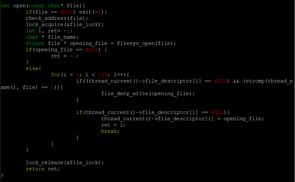 파일의 포인터도 정상적으로 받았다면 이 Process의 file_descriptor[]를 돌면서 빈 공간을 찾는다. 만약 비어있는 file descriptor number를 찾았는데 현재 thread의 이름과 file의 이름이 같으면 다른 file이 write를 할 수 없도록 file_deny_write()를 호출한다.
