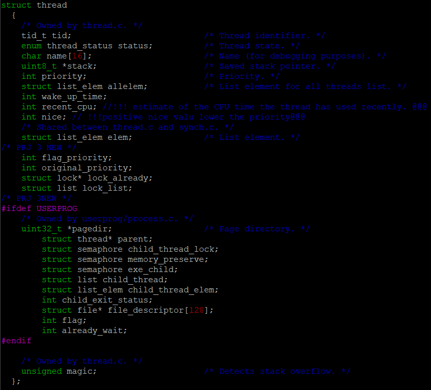 위에 보면 struct file * file_descriptor[128], struct thread * parent, struct semaphore exe_child, int flag가 추가되었다. struct file * file_descriptor[]는 이 Process와 연관된 file descriptor들을 관리하려고 만든 구조체이다. 아까도 말했지만 128로 지정한 이유는 Pintos Manual에 그런 식으로 나와있기 떄문이다.