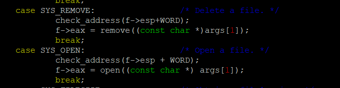 대충 이런식이다. 지난 프로젝트에서 만들었던 system call과 같다. userprog/syscall.c 에 있는 system call handler의 switch 문을 확장하고 각 case마다 "지금 접근하려는 주소가 정상적인 주소인지" 체크한 후 해당하는 함수를 구현한다. 만약 return 값이 있는 system call 이라면 eax로 return 값을 받는다. 이건 manual에 있는 부분이므로 간단하고 행복하게 구현할 수 있다. 예시로 나와있는 remove는 boolean 값을 return 하기 때문에 f->eax로 return 값을 받았다.