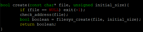 매개변수로 받은 file의 주소값이 NULL이라면 파일을 생성할 수 없으므로 exit(-1)을 호출한다. 그게 아니면 filesys_create()를 통해서 새로운 file을 만든다.