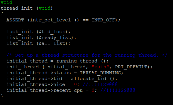 명세서에 나온대로 thread_init(thread가 처음 만들어 질 때)에서 각 thread의 nice와 recent_cpu 값을 0으로 초기화한다.