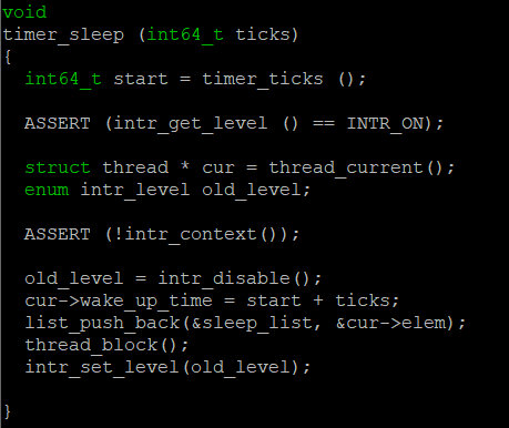 timer_sleep() 함수가 호출되면 현재 ticks와 매개변수로 들어온 ticks를 더해서 wake_up_time을 설정한 후 아까 만들어뒀던 sleep_list에 추가한다. (list_push_back())그 후에 thread_block()을 호출해서 해당 thread의 state가 BLOCKED 되도록 한다.