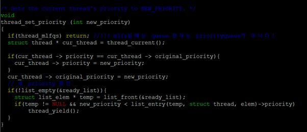 Thread_set_priority는 thread의 priority를 바꾼다. Running thread의 priority와 비교해서 새롭게 설정된 priority가 더 크면 thread_yield()를 호출한다. (Preemptive Scheduling)