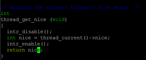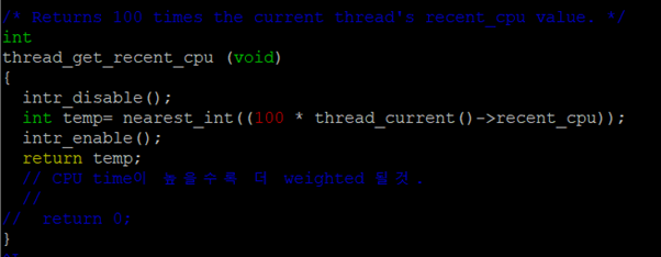 현재 thread의 recent cpu 값에 100을 곱한 후 가장 가까운 integer 값을 돌려준다. 위에서 소개한 nearest_int 함수가 쓰였다.