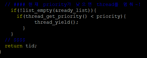그리고 만들어진 thread의 priority가 현재 CPU를 점유하고 있는 thread의 Priority보다 크다면 thread_yield()를 호출해서 running thread를 교체한다.