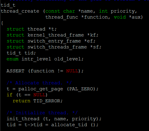 thread_create의 매개변수를 잘 보면 priority가 있다! PintOS에서 thread의 Priority는 0 ~ 63 사이이다. PintOS 내에서 각각 PRI_MIN과 PRI_MAX로 #define 되어 있다. 이 때 priority 값이 낮을수록 우선순위가 낮다. 그러니까 Priority 가 0이면 제일 priority가 우선순위가 낮다. (0이 PRI_MIN으로 정의된 까닭을 생각하자)