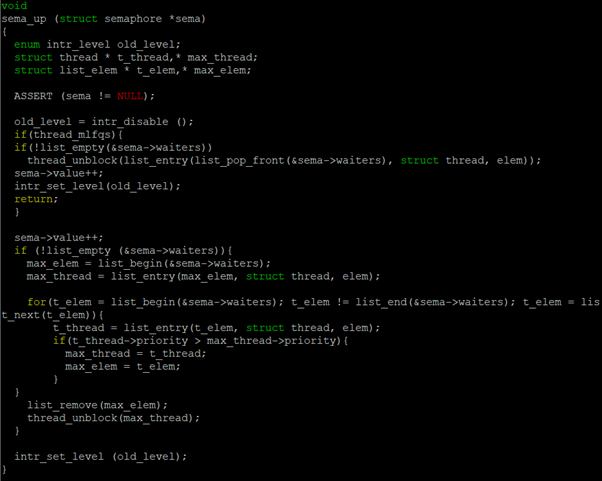 Sema_up을 할 때도 sema 구조체 waiters에서 semaphore를 기다리는 thread들 중 가장 priority가 높은 thread를 찾아서 sema_up을 한다. 사실 이런 작업을 Sema_down이나 Sema_up 둘 중 하나에서만 하면 되지만, 그냥 둘 다 했다 ㅎ.