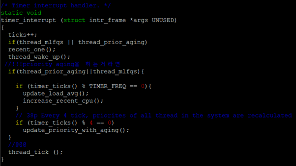 명세서에 나와있는대로 tick이 네 번 진행될 때마다 모든 thread의 priority를 update(aging) 해야 한다. 이 기능을 update_priority_with_aging() 함수가 한다. All_list에 저장된 모든 thread를 순회하면서 주어진 계산식에 맞게 priority를 update한다. 만약 priority가 PRI_MAX보다 높으면 PRI_MAX로 지정한다. PRI_MAX가 상한선이기 때문이다. 만약 priority가 PRI_MIN보다 낮으면 PRI_MIN으로 지정한다. PRI_MIN이 하한선이기 때문이다.