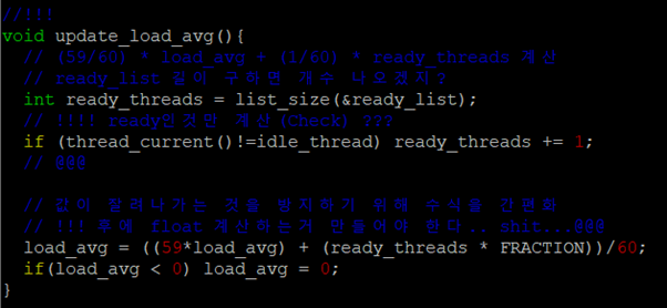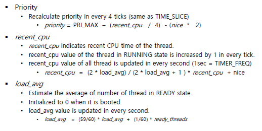 이 연산을 위해서 FRACTION을 define 했다. 이제 nice와 priority, recent_cpu를 계산할 준비는 모두 되었다. 게다가 각 함수의 interface는 미리 구현되어있으므로 그 내용만 채우면 된다. 사람에 따라 소수점 연산을 미리 함수로 만들어서 적용하는 사람도 있다. 편할대로 하면 된다.