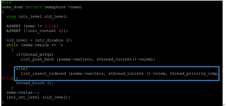 Sema_down의 기능은 이전 프로젝트에서 다루었다. Sema 구조체는 waiters라는 list를 가지고 있다. Waiters는 sema를 기다리고 있는 thread의 list이다. 즉 semaphore에 의해 block되어있다. 그 list에 새롭게 block된 list를 넣을 때 priority에 따라 정렬해서 넣는다. 세 번째 매개변수인 thread_priority_comp는 다음과 같다.