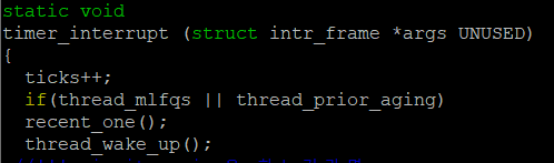위 함수는 timer_interrupt()라는 함수다. device/timer.c에 있다. 이 함수에서 ticks를 1씩 증가시킨다. 이 tick이 PintOS 안의 Clock이라고 볼 수 있다. tick이 증가할 때마다 thread_wake_up함수를 실행시켜서 sleep_list에 있는 잠든(Zzz) Thread 중 깨어날 thread가 있는 지 살핀다. (thread_wake_up())