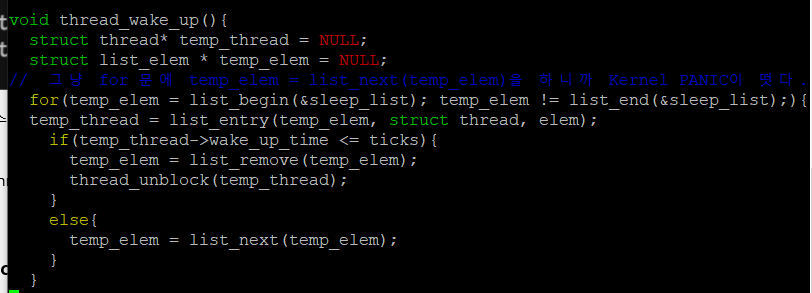 thread_unblock을 하고 list_remove를 하면 어떻게 될까?... sleep_list가 아니라 ready_list에 있는 thread에 대고 list_remove를 하는 셈이다. 구체적인 오류가 궁금하면 직접 실행해보자 ㅎ... 이렇게 하면 Alarm Clock을 구현했다고 볼 수 있다.