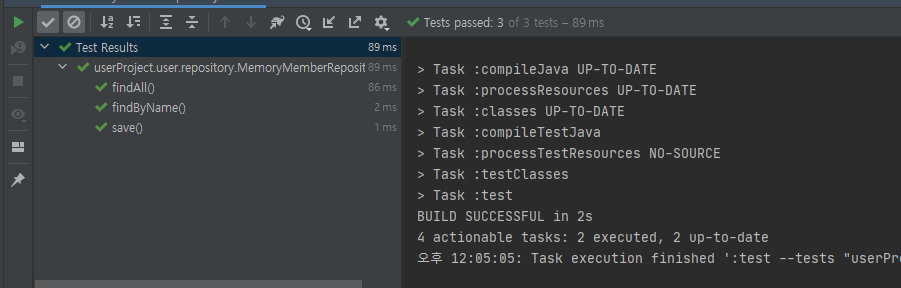 save()--> findByName() --> findAll()이지만 테스트가 꼭 그 순서대로 실행되는 건 아니다. 그렇기 때문에 테스트가 끝날 때마다 초기화를 해줘야 한다. 즉, 절대 코드 순서에 의존적이도록 테스트 코드를 짜면 안 된다!!!