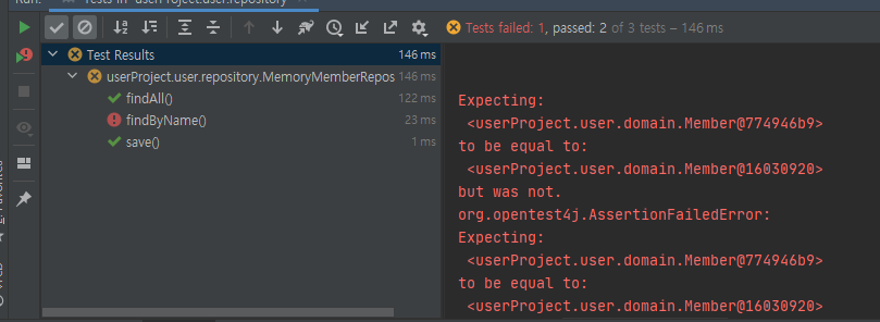 근데 에러가 떳다. findByName이 테스트를 통과하지 못했다. 코드를 아무리봐도 이상한 게 없는데???