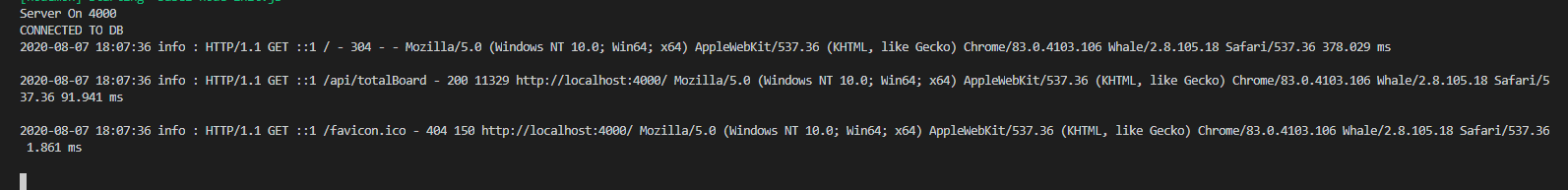 2020-08-07 18:07:36 info : HTTP/1.1 GET ::1 /api/totalBoard - 200 11329 http://localhost:4000/ Mozilla/5.0 (Windows NT 10.0; Win64; x64) AppleWebKit/537.36 (KHTML, like Gecko) Chrome/83.0.4103.106 Whale/2.8.105.18 Safari/537.36 91.941 ms